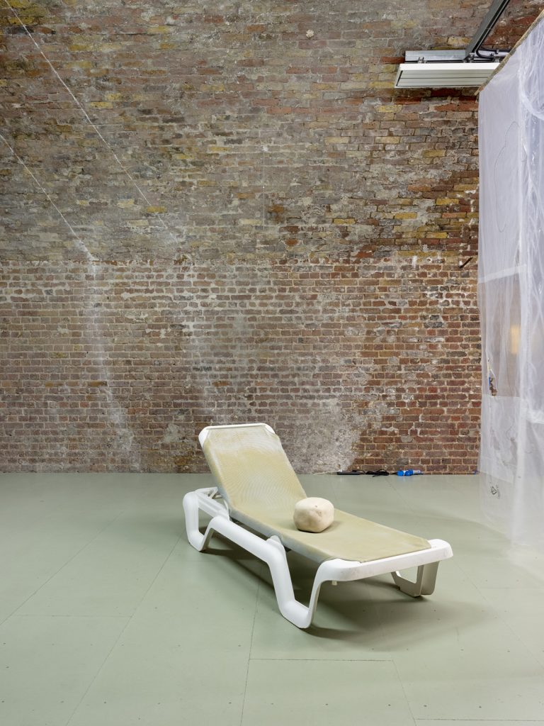 Tender Orbits (PAM-D in the desert) (2024). Tactile sculpture from off-cuts of wood, decommissioned sun lounger from a resort, used plastic packaging, leather from repurposed artwork, hand-stitching.